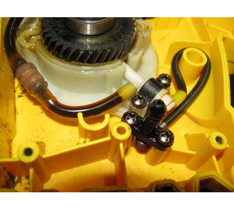 Электропила оснащена щеточным электродвигателем бокового расположения, который при мощности в 1,5 кВт обеспечивает движение пильной цепи с линейной скоростью – 13,6 м/сек. Питание пилы осуществляется от бытовой электросети 220-230 В / 50 Гц.