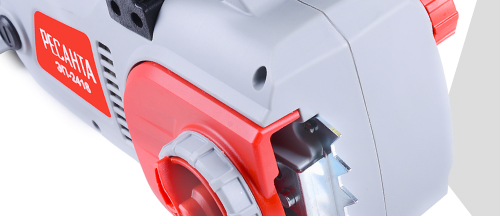 Пила оснащена автоматическим тормозом цепи в виде щитка, что обеспечивает безопасность оператора. Рукоятка пилы крепко сидит в руке, имеет фиксатор, не допускающий отсоединения штекера от розетки.