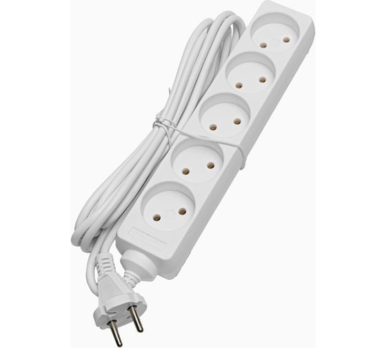 Удлинитель бытовой без заземления, розетки, шт. - 5, длина провода, м - 3, цвет - белый, провод - ПВС 2х0,75, номинальная сила тока, А - 10, макс. мощность, Вт - 2200