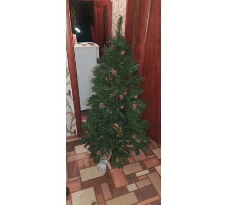 Есть шишки, смотрится очень хорошо, крепления веток держат надежно, ножка не шатается, запаха нет.