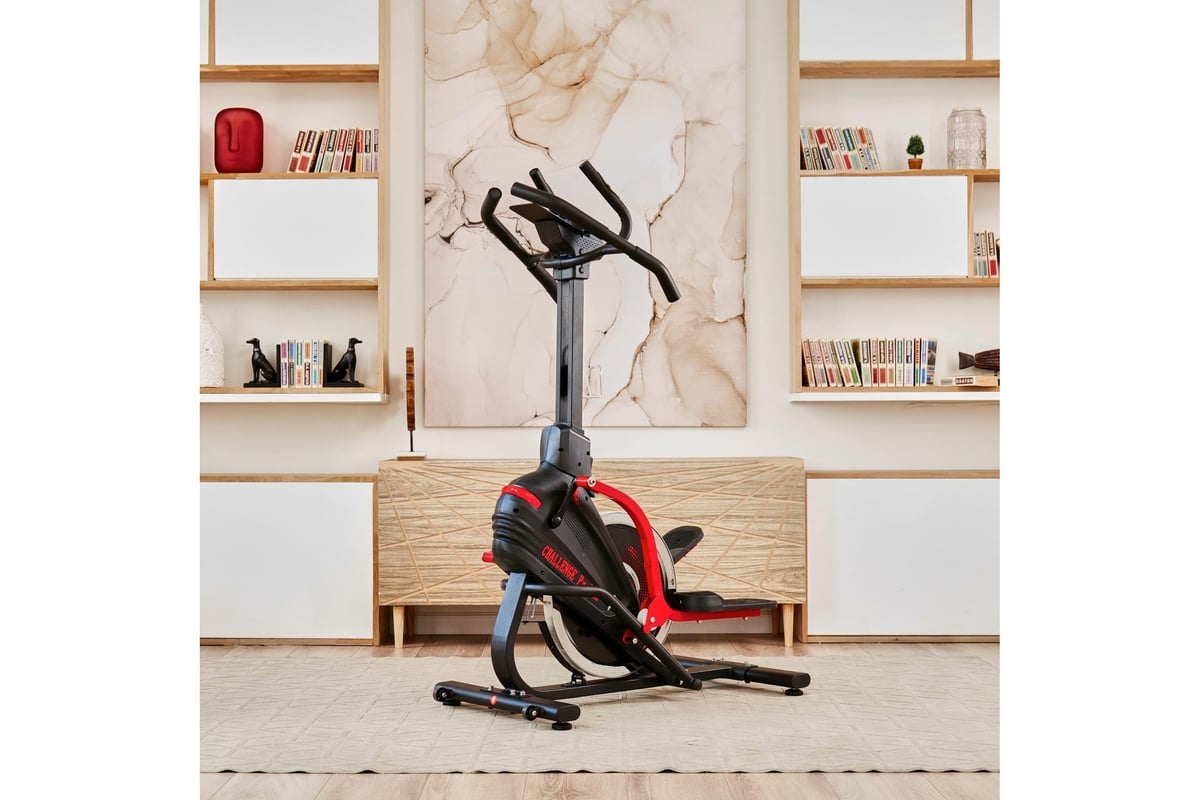 Эллиптический тренажер с элементом степпера DFC CHALLENGE ProMAX E8019CR имитирует восхождение в гору под углом 40° и высотой шага 22 см, и нагружает больше различных групп мышц, чем классический эллептик или степпер.