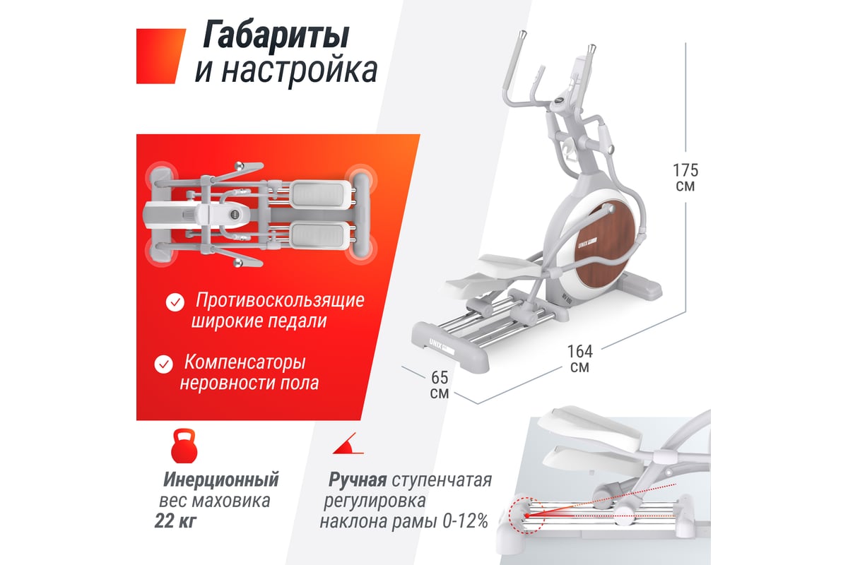 В эллиптическом тренажере UNIX Fit MV-850 маховик расположен спереди. Такая конструкция позволяет увеличить максимальную длину шага и обеспечивает естественное перемещение педалей.