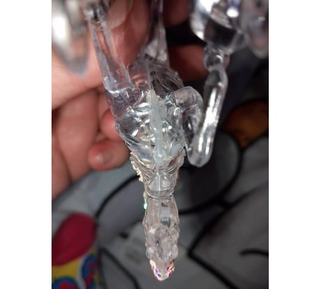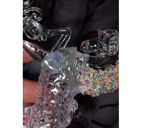Лошадка состоит из 2 частей. И эти часть не качественно склеяны. Держит клей хорошо, но портится внешний вид. Клей торчит. А в корпусе лошадки замутнение. Одно радует, этот клей можно удалить и проклеить более качественно.