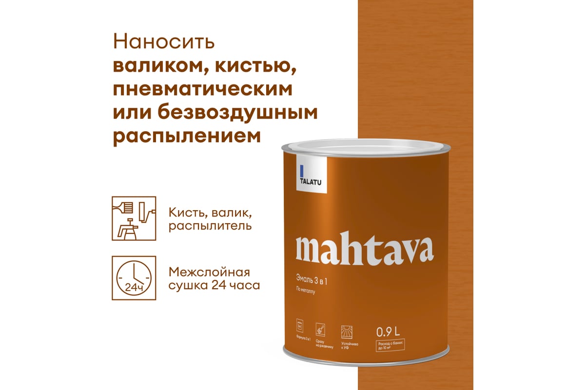 Грунт-эмаль алкидная Mahtava по ржавчине для внутренних и наружных работ по металлу. Сочетает в себе свойства преобразователя ржавчины, антикоррозийной грунтовки и декоративного финишного покрытия. Окрашивать металлические поверхности можно без предварительного грунтования.