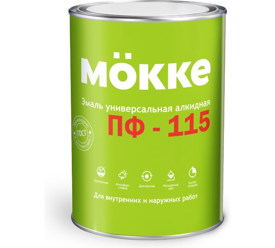 Алкидная эмаль ООО Гранд Пак ПФ-115 MÖKKE , салатовый, 0.8 кг 6019 предназначена для обработки металлических, деревянных ,бетонных, цементных, кирпичных и других поверхностей, подвергающихся атмосферным воздействиям, а также для окрашивания внутри помещений. Благодаря составу, продукт равномерно распределяется по основанию и образует сверхпрочное покрытие, устойчивое к вредным факторам окружающей среды. Состав — алкидный лак, двуокись титана, пигменты, сиккатив, растворитель, целевые добавки и наполнители Расход 80-120 г/м в зависимости от свойств окрашиваемой поверхности Инструменты : кисть, валик, краскопульт Растворитель : уайт-спирит, скипидар или сольвент в соотношении 1:1 Время высыхания при температуре (20±2) °С и влажности воздуха не более 65- 70% – 24 часа.