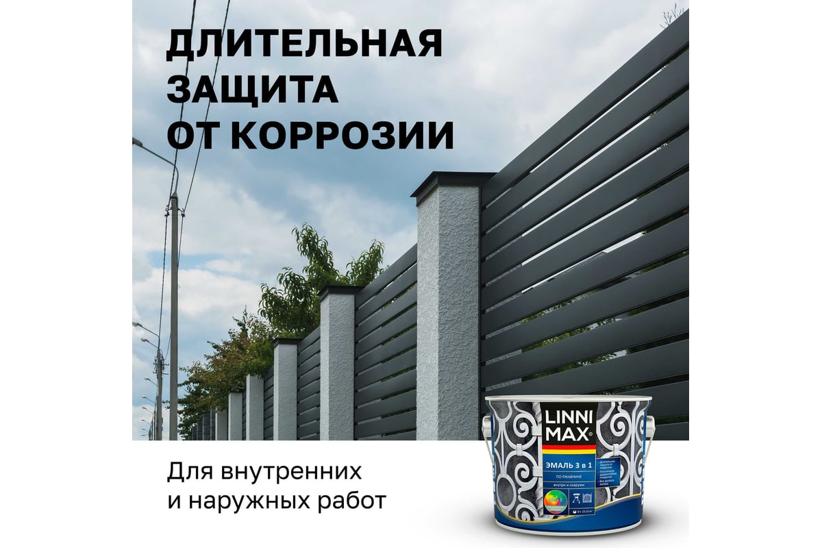 LINNIMAX Эмаль алкидно-уретановая по ржавчине 3 в 1 – инновационное решение для антикоррозионной защиты черных металлов и оцинкованных поверхностей. Объединяя в себе функции адгезионной грунтовки, антикоррозионной защиты и декоративной эмали, продукт идеально подходит для внутренних и наружных работ.