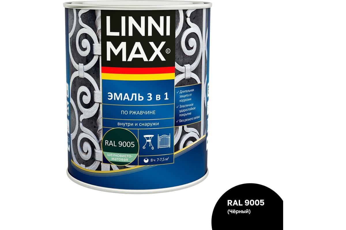 Эмаль алкидно-уретановая LINNIMAX по ржавчине 3 в 1 RAL 9005 черная 0,75 л 948105267