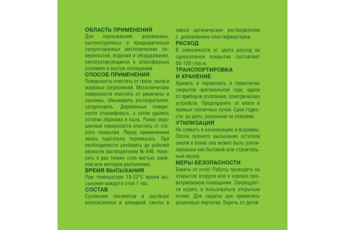 Благодаря составу, продукт образует атмосферостойкое, глянцевое покрытие. При температуре воздуха от 18 до 22 градусов время высыхания каждого слоя 1 час.