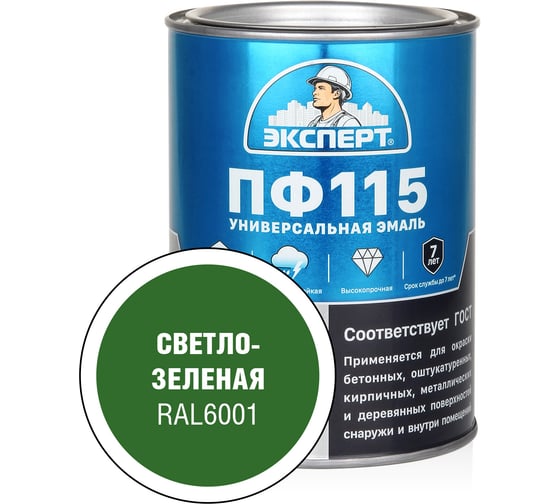 Эмаль ЭКСПЕРТ ПФ-115 глянцевая светло-зеленая 0,8 кг 34106 применяется для защитно-декоративного окрашивания металлических, деревянных и минеральных поверхностей снаружи и внутри помещений. Продукт используют для обработки дверей, рам, перил, наличников, плинтусов, оград, механизмов и конструкций.