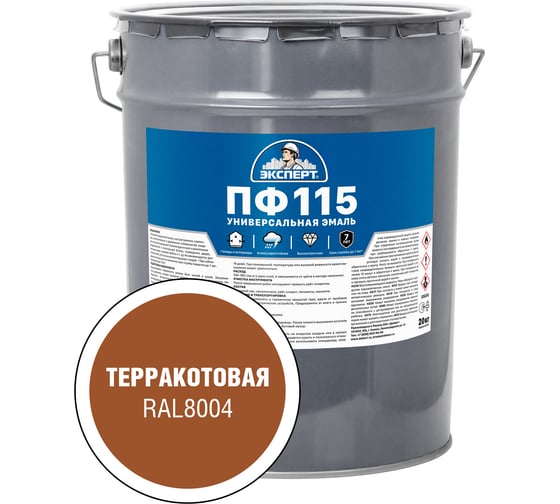 Эмаль ЭКСПЕРТ ПФ-115 глянцевая, терракотовая, 20 кг 34134 применяется для защитно-декоративного окрашивания металлических, деревянных и минеральных поверхностей снаружи и внутри помещений. Продукт используют для обработки дверей, рам, перил, наличников, плинтусов, оград, механизмов и конструкций.