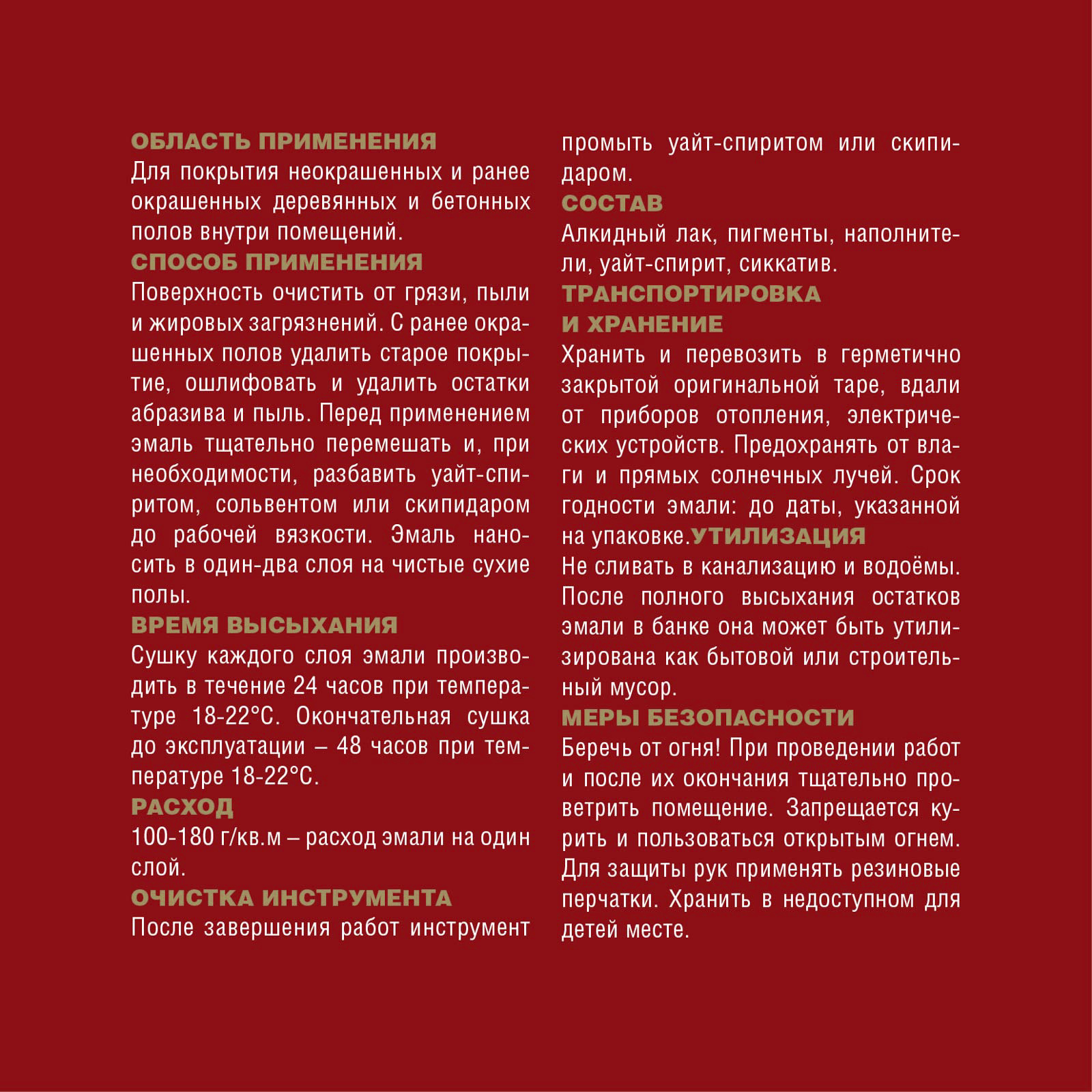 Поверхность должна быть прочной, чистой и сухой. Эмаль распределяют кистью, валиком или краскопультом в 1-2 слоя. При температуре от 18 до 22 градусов время высыхания каждого слоя 24 часа.