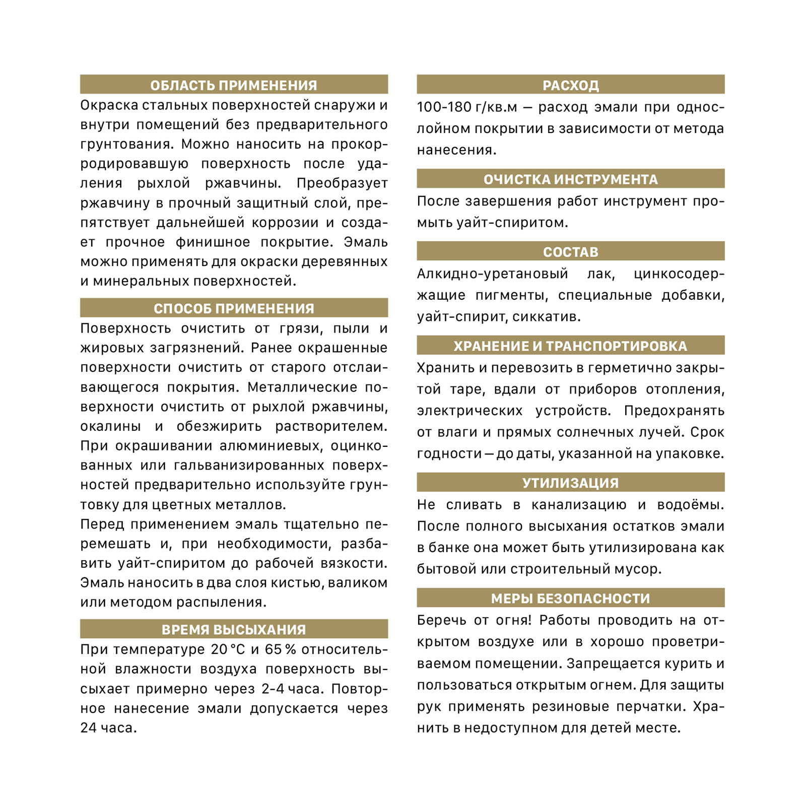 - Краска создана по формуле 3 в 1 (преобразователь ржавчины, грунтовка и декоративное финишное покрытие).