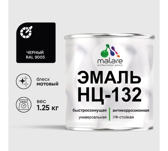 Эмаль MALARE НЦ-132 для металла, по дереву, для минеральных поверхностей, RAL 9005, черный, матовая, 1.25 кг 2038094832229