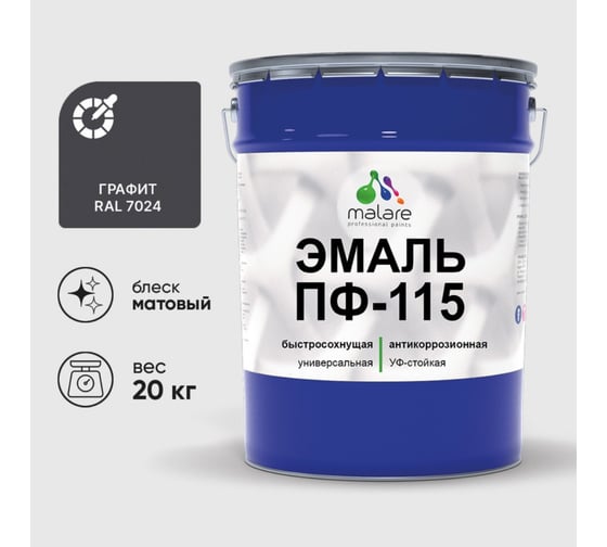 Эмаль MALARE ПФ-115 для металла, по дереву, для минеральных поверхностей, RAL 7024, графитово-серый(темный), матовая, 20 кг 2038119869063