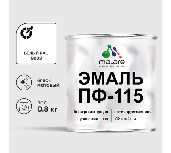 Эмаль MALARE ПФ-115 для металла, по дереву, для минеральных поверхностей, RAL 9003, белый, матовая, 0,8 кг 2038119867922