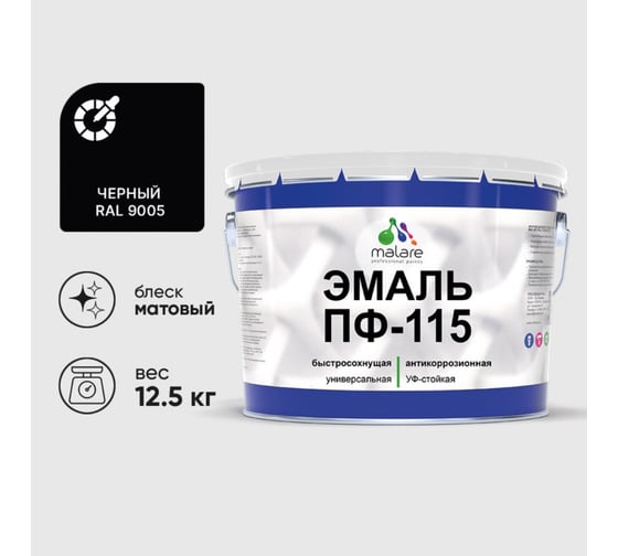 Эмаль MALARE ПФ-115 для металла, по дереву, для минеральных поверхностей, RAL 9005, черный, матовая, 12,5 кг 2038243711030