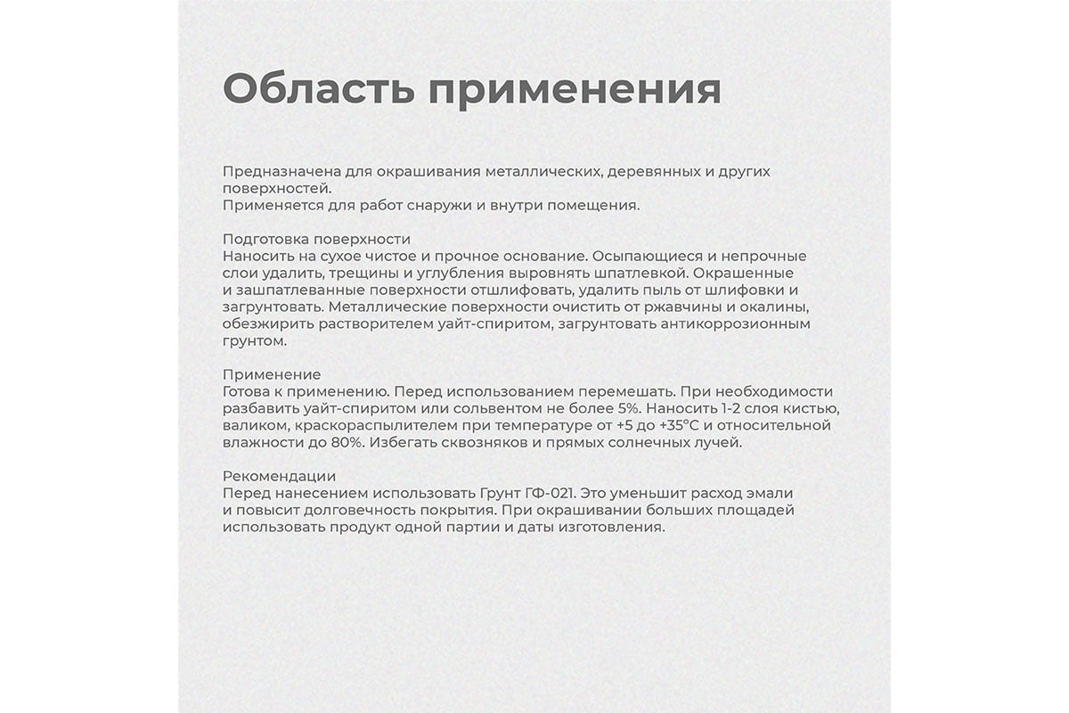 Рекомендации Перед нанесением использовать Грунт ГФ-021. Это уменьшит расход эмали и повысит долговечность покрытия. При окрашивании больших площадей использовать продукт одной партии и даты изготовления. Степень глянца: глянец. Поверхность: металл, дерево. Состав: алкидный лак, пигменты, наполнители, растворитель, сиккатив, вспомогательные добавки. Растворитель: сольвент, уайт-спирит. Запах: присутствует. Высыхание: 24 часа. Расход: 100-180 г/м². Срок годности: 24 месяца. Температура нанесения: от +5 до +35 ºС. Условия транспортировки: морозостойкая (до -40 ºС). Срок службы: до 7 лет, в зависимости от условий нанесения. Стандарт ТУ 2312-021-88753220-2006. Ярко-зеленый