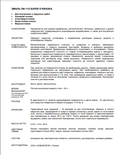 В отзывах о красках данного производителя неоднократно писали, что в банке мало краски. У меня всё в порядке; банка действительно далеко не полная, но в характеристиках указан вес краски (нетто – 0,9 кг), он соответствует (банка с краской весит чуть больше килограмма, вполне похоже на то, что чистый вес краски 0,9 кг.). Ради интереса взвесил банку краски (тоже вес 0,9) другого производителя – оказалась даже немного легче. Сама краска несколько густовата, плохо растекается по поверхности, после покраски не получается гладкой плёнки (красил, не разбавляя; наверно, если разбавить, было бы лучше). Но в целом качество приемлемое.
