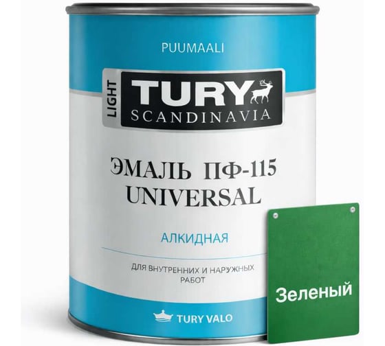 Эмаль TURY Универсал ПФ-115 зеленая, 0.9 кг 2007169 на основе алкидной смолы для внутренних и наружных работ. Применяется для окраски деревянных, бетонных, кирпичных, оштукатуренных и загрунтованных металлических поверхностей, гипрока, ДСП, ДВП и ОСБ-плит.Благодаря составу, продукт подходит для помещений с повышенной влажностью, а также поверхностей, подверженных длительному атмосферному воздействию. Используют для обработки как новых, так и для ранее окрашенных поверхностей (кроме полов).