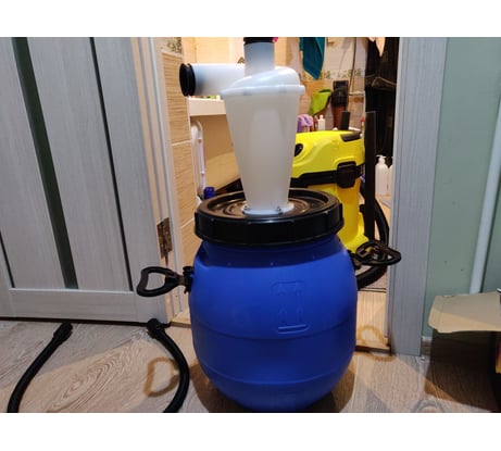 Искал ёмкость из плотного пластика для циклона - эта бочка подошла по всем параметрам. Верхнюю завинчивающуся крышку просверлил конусным сверлом и расширил отверстия до подходящего. Пока гравером расширял - один маленький кусочек скололся (но это было в зоне удаления), но в целом ничего не крошилось. Стенки вполне толстые, воздухом не деформирует. Планирую потом кольцами металлическими защитить пластиковый переход, а то такая конструкция может к трещине привести с такими напряжениями от шлангов. Но Полоцкпласт - это вряд ли Италия или Россия.