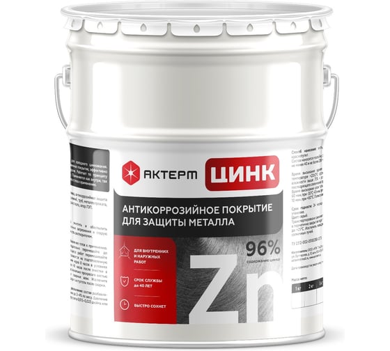 АКТЕРМ Цинк Про - двухкомпонентный лакокрасочный материал, представляющий собой суспензию микронизированной цинковой пыли (содержание цинковой пыли 96 масс %) в эпоксидном пленкообразователе и отвердителя аминного типа. Материал образует однородную матовую пленку, обеспечивающую противокоррозионную защиту металлических подложек за счет сочетания активной (катодной) и пассивной (пленочной) методов защиты. Температурный режим эксплуатации -60°С до +120°С. Срок службы покрытия в категории коррозионной активности атмосферы С5 согласно ГОСТ 34667 составляет свыше 25 лет.