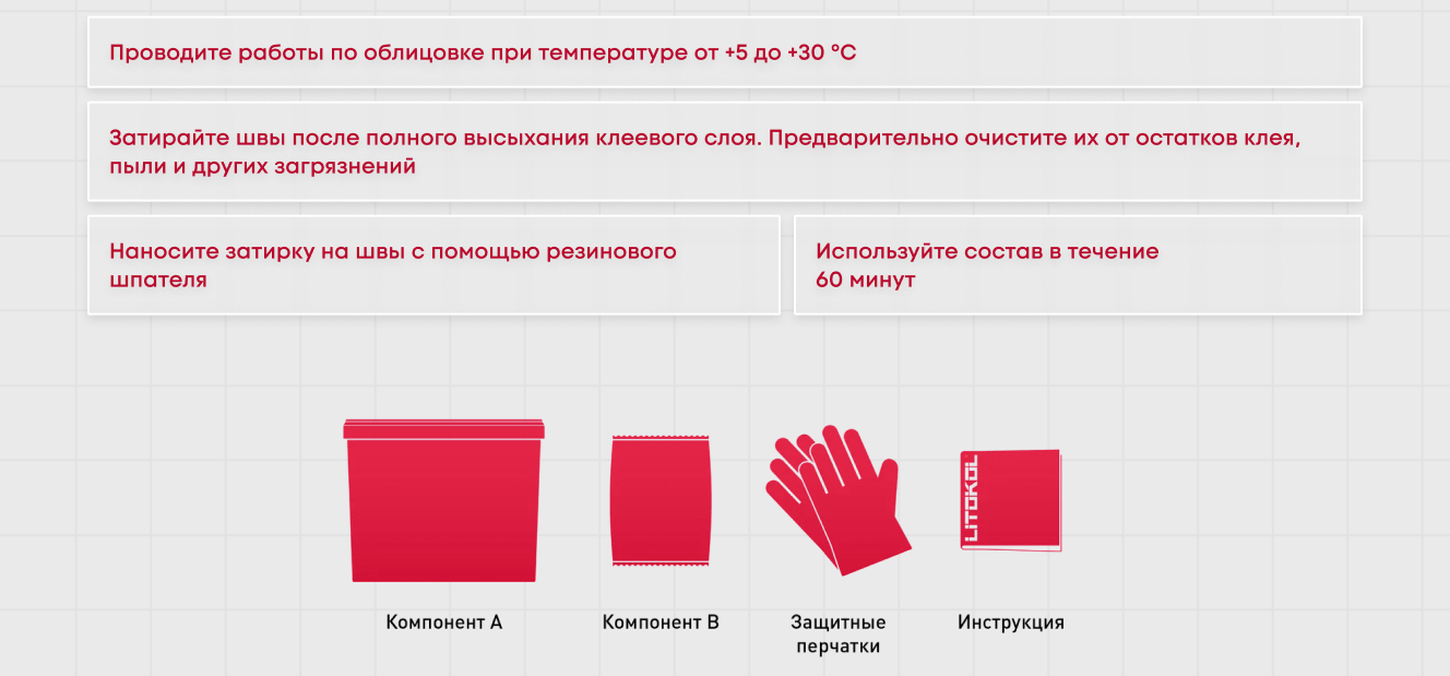 посмотрев несколько роликов в ютюбе и прикупив 1) резиновый шпатель 2) Сменный блок 109W и 3) синтетическую губку LITOKOL Арт. 128G принялся за работу . в целом заметил что новичку лучше не разводить больше чем 400 грамм затирки ! чтобы успеть всё выработать и затирка не стала твердеть . в целом своим результатом доволен . на фото также предоставлен цвет затирки ( кучка оставшейся затирки оставленная для любопытства и наблюдения процесса отвердевания )