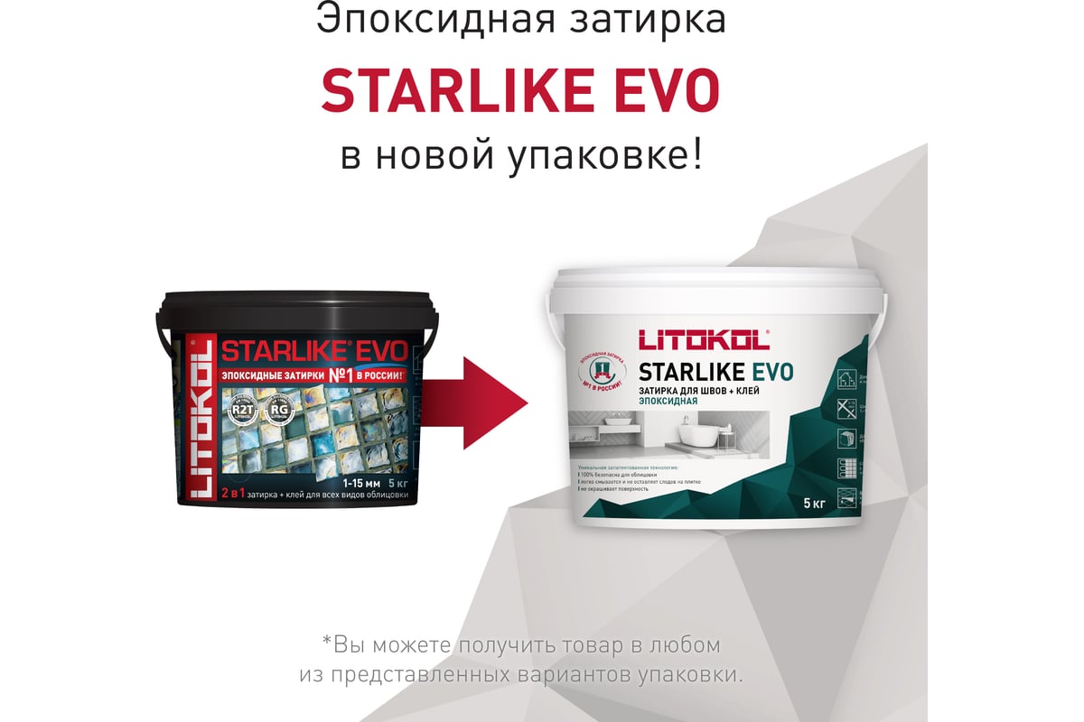 STARLIKE EVO двухкомпонентный эпоксидный кислотостойкий, щелочестойкий состав для затирки межплиточных швов с шириной шва от 1 до 15 мм и использования в качестве клея для всех видов облицовочной плитки и мозаики.