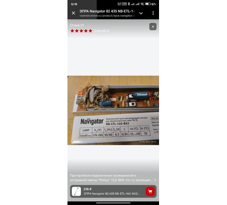 При пробном подключении проверенной и исправной лампы "Philips" TLD 18W что-то затрещало и раздался звук взрыва внутри корпуса с обильным дымовыделением. Даже что-то лохматое вылетело через щелку. При треске выключить не успел, но зато успел отвернуться... При вскрытии корпуса на плате обнаружился разрушенный элемент.