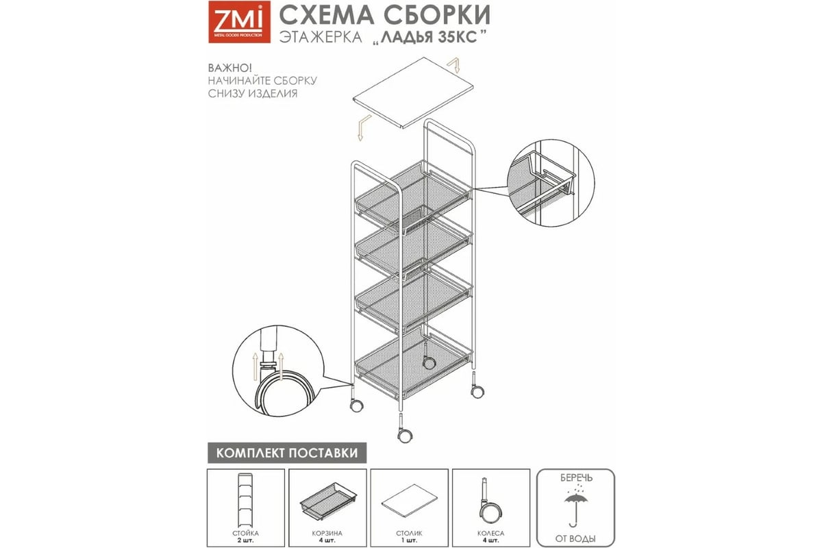 Этажерка / Стеллаж для хранения ЗМИЛадья 35КС / 4 полки / с колёсами / цвет белый Э 410 Б Э 410 Б