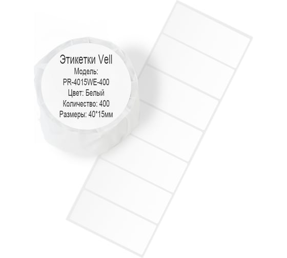 Универсальные этикетки в цвете белый Vell 535171 поставляются в упаковке в количестве 400 шт. Длина каждой этикетки равна 40 мм, ширина - 15 мм.