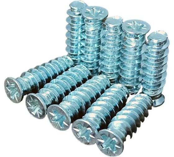 Винт мебельный потайной оцинкованный, также известный как евровинт — это универсальный и надежный крепеж, широко применяемый в мебельном производстве, строительстве и при монтаже различных конструкций. Его отличительная особенность — крупная резьба, обеспечивающая высокую скорость вкручивания и надежное сцепление с материалом, чаще всего с древесными плитами (ДСП, ЛДСП, МДФ). Надежное соединение для мебели: Идеально подходит для сборки корпусной мебели, особенно выдвижных ящиков, направляющих, перегородок и других ответственных узлов. Крупный шаг резьбы обеспечивает отличную удерживающую способность в плитных материалах. Удобство и скорость монтажа: Конусовидная потайная головка с крестообразным шлицем типа PZ позволяет плотно утопить винт заподлицо с поверхностью, создавая аккуратный вид. Шлиц PZ оптимизирован для работы с шуруповертом, что обеспечивает быструю и удобную установку. Усиленная фиксация: Резьба, выполненная по всей длине стержня, позволяет использовать винт на разной глубине и обеспечивает максимальную площадь контакта с материалом, повышая прочность соединения на вырыв. Технологичность: Монтаж требует предварительного засверливания направляющего отверстия меньшего диаметра, что предотвращает раскалывание материала и обеспечивает точное позиционирование винта. Область применения: Мебельное производство и сборка: сборка каркасов, крепление направляющих для ящиков, фасадов, задних стенок и фурнитуры.