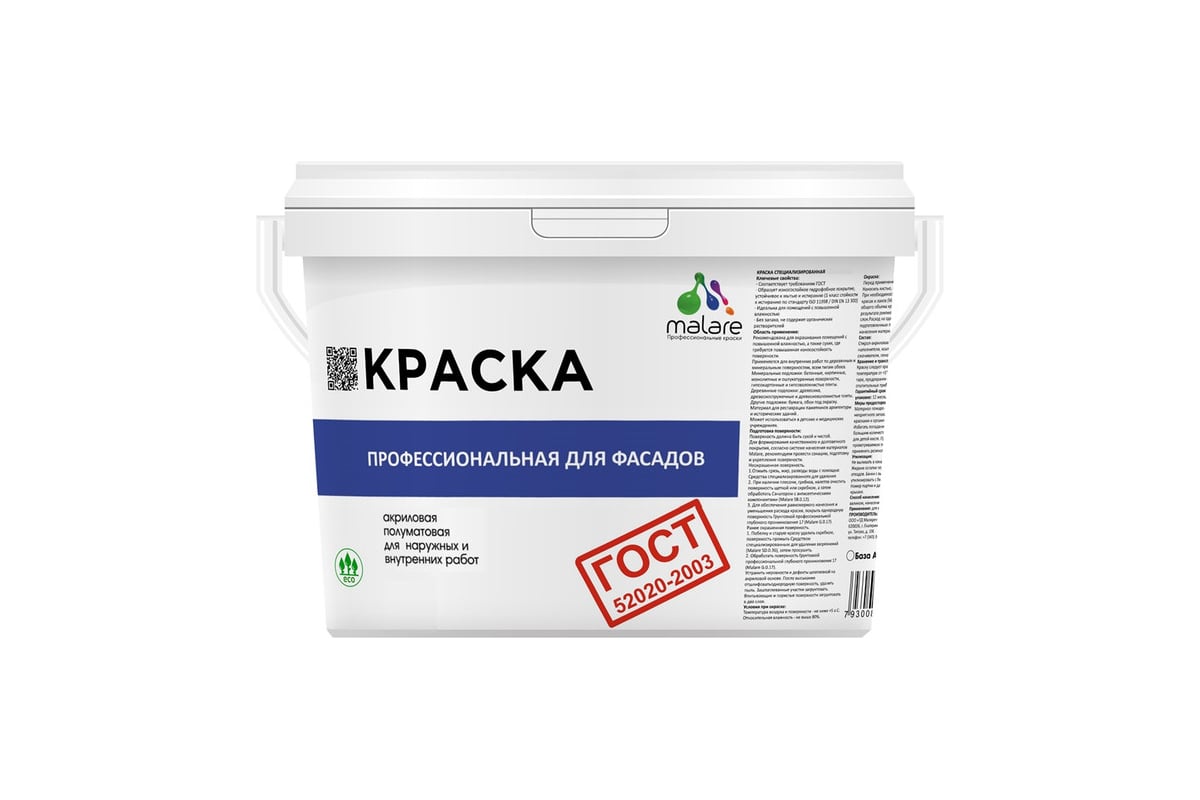 Фасадная краска MALARE ГОСТ быстросохнущая предназначена для окрашивания фасадов и интерьеров зданий и сооружений.