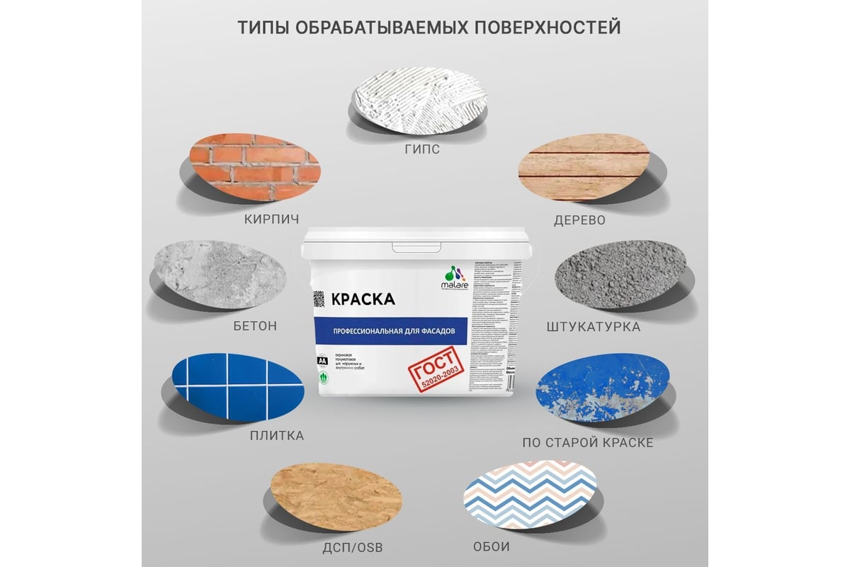 Фасадная краска MALARE ГОСТ быстросохнущая предназначена для окрашивания фасадов и интерьеров зданий и сооружений.