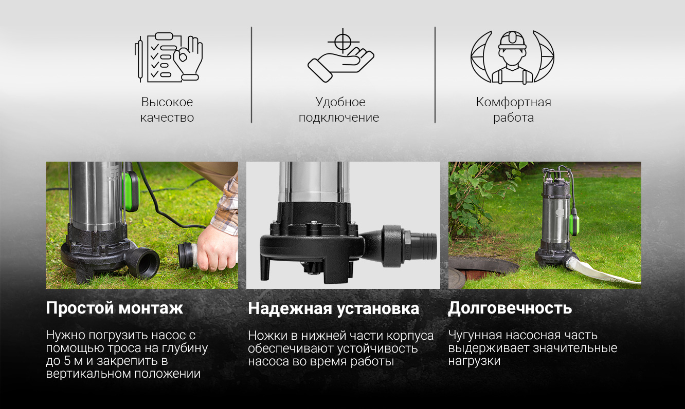 - Долговечность — чугунная насосная часть выдерживает значительные нагрузки