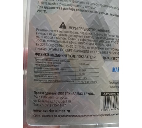 Отзывы о фиксаторе резьбы Алмаз разборный 10 г AG-548