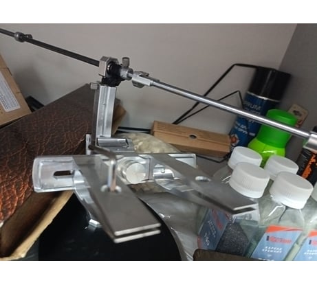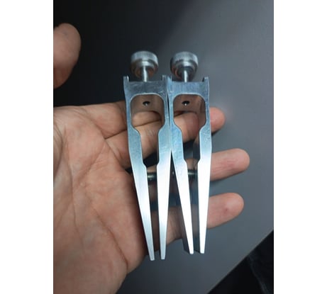 Зажимы изготовлены из цельного куска авиационного алюминия, позволяют подстраивать зажим под любую форму клинка и обеспечивать симметричность установки. Благодаря двум точкам захвата, прогиб лезвия исключен. Есть возможность независимого перемещения зажимов, по всей длине рамки. Отсутствует необходимость калибровки. С этими зажимами становится возможным заточка ножей со скандинавскими спусками по линии спусков. Подходят для кухонных и филейных ножей с узким обухом, ножей-брелков, опасных бритв, ножей со сканди-спусками и т.п.