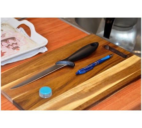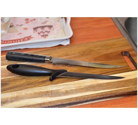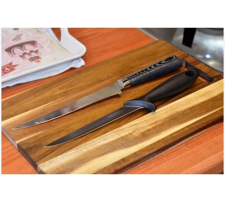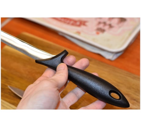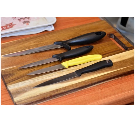 Очень удобный, "мягкий" и упругий, прекрасная эргономичная рукоять, хорошо заточен, оптимальный размер, отлично и без усилий режет, справляется с разными продуктами.