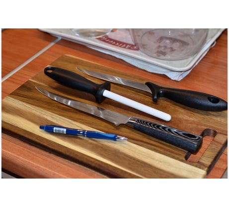 Простой кухонный нож, который не жалко затупить. Брал в комплект такому же Эссенталу в 10см (малый фрутоножик-овощник), у которого такая же сталь, удобная рукоять и размер лезвия.