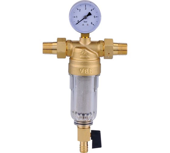 Монтаж: Фильтр монтируется в разрыв трубопровода с резьбовым подключением 1/2, с учетом направления потока, указанного на корпусе. Рекомендуется предусмотреть доступ к стеклянной колбе для визуального контроля и обслуживания. Установка выполняется на прямом участке трубы, с последующей проверкой герметичности соединений и корректности показаний манометра.