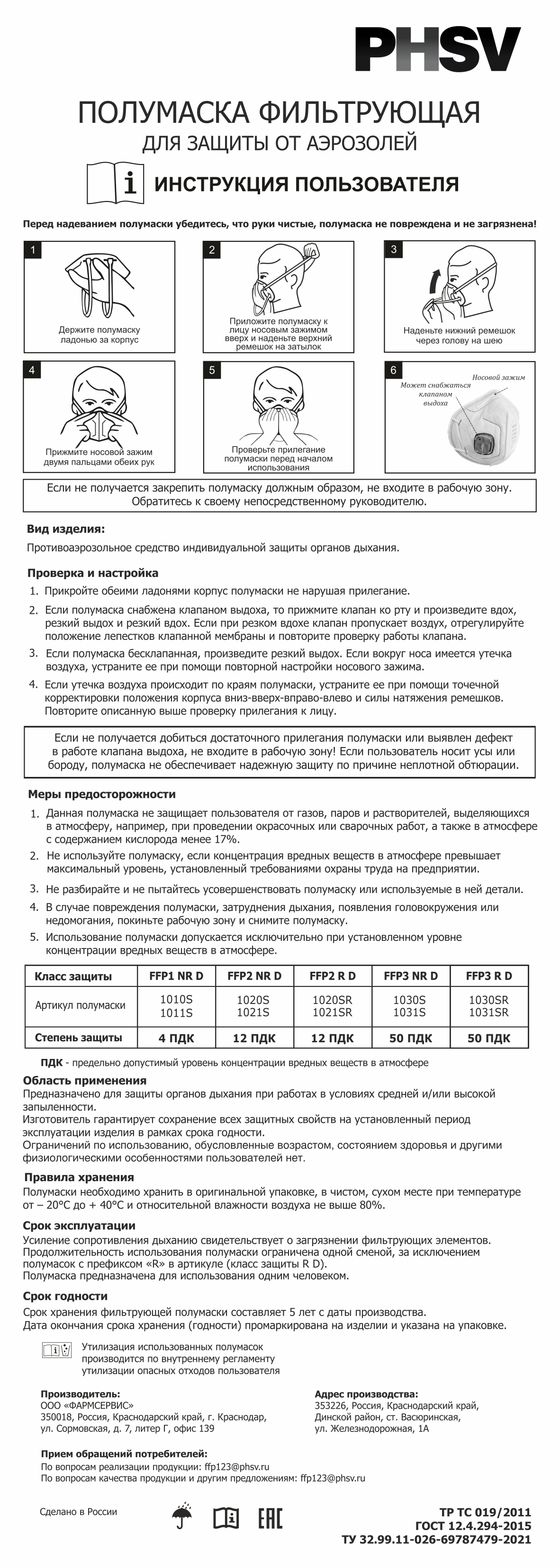 Технические характеристики фильтрующей полумаски PHSV 1011S