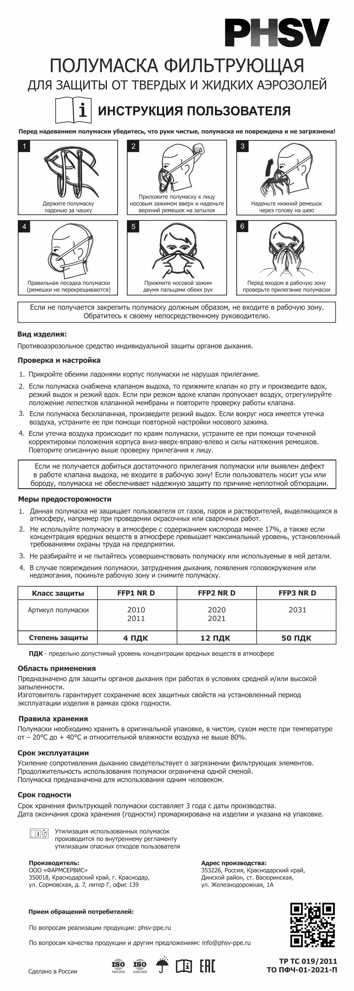 Технические характеристики фильтрующей полумаски PHSV 2031