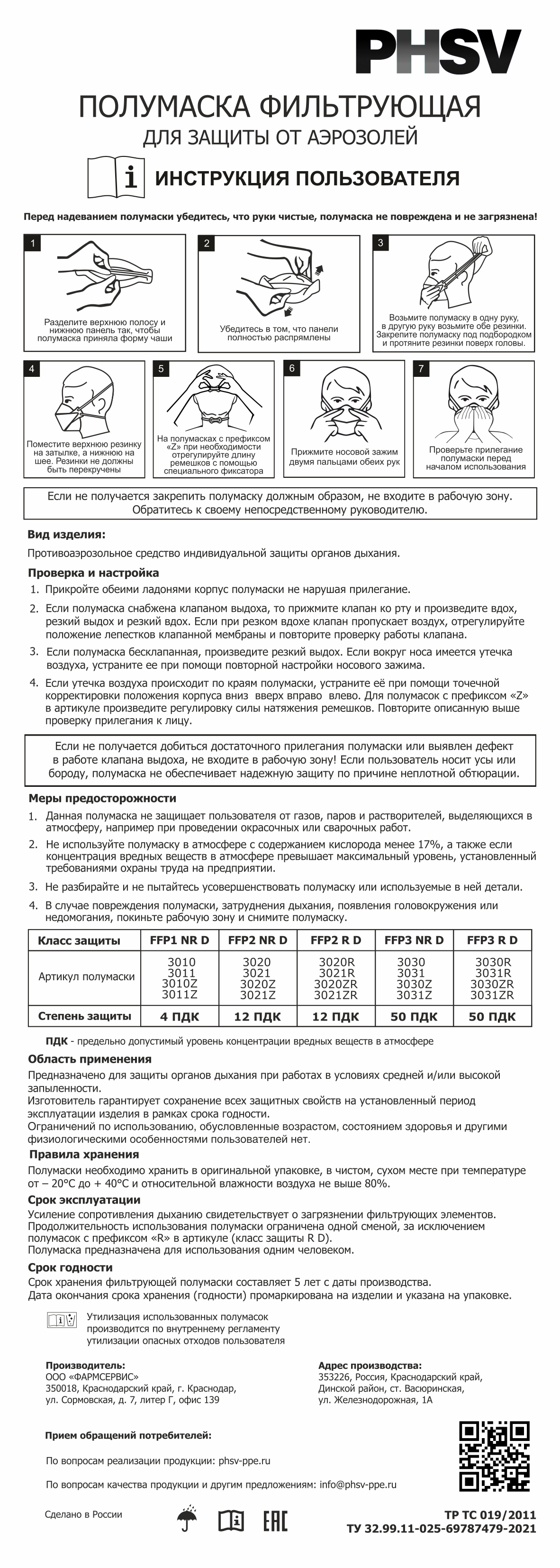 Технические характеристики фильтрующей полумаски PHSV 3011Z