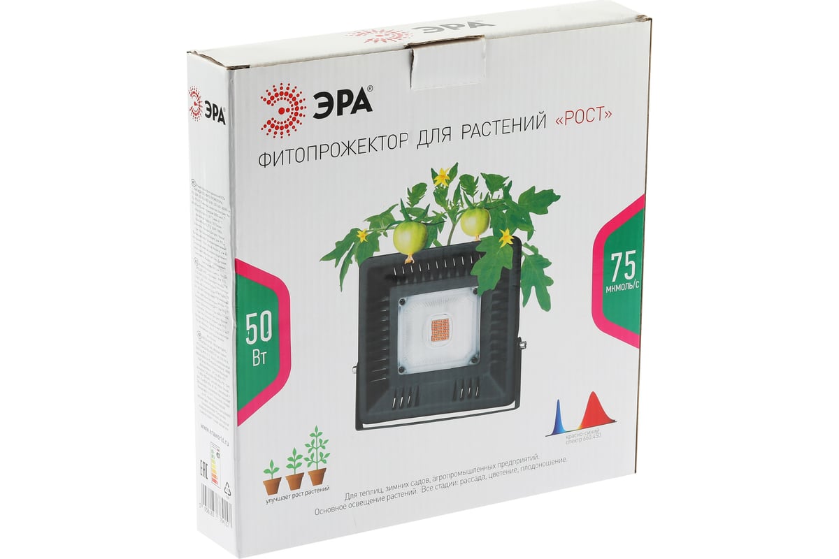 Фитопрожектор для растений светодиодный ЭРА FITO-50W-LED BLUERED для цветения и плодоношения Б0039033 предназначен для выращивания растений в теплицах и оранжереях на всех стадиях: рассады, цветения, плодоношения. Главной особенностью фитолампы является красно-синий спектр излучения. Он заботится об увеличении урожая и быстром росте растений. По сравнению с белым светом красно-синий увеличивает эффективность поглощения в несколько раз.