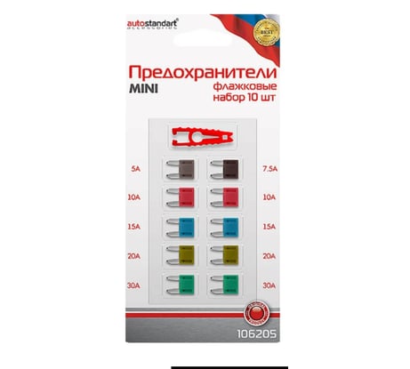 Предохранители флажковые MINI набор 10 шт. с щипцами AutoStandart. Штыри выполнены из высококачественного цинкового сплава для надежной работы в суровых условиях. Имеют заходные фаски для легкой установки. Корпус из термоустойчивого, не поддерживающего горение полиамида. На корпусе контрастным цветом нанесена маркировка номинального тока предохранителя. Цвет корпуса соответствует международным кодировочным стандартам. Набор из 10 штук и пинцет для легкого извлечения перегоревшего предохранителя.