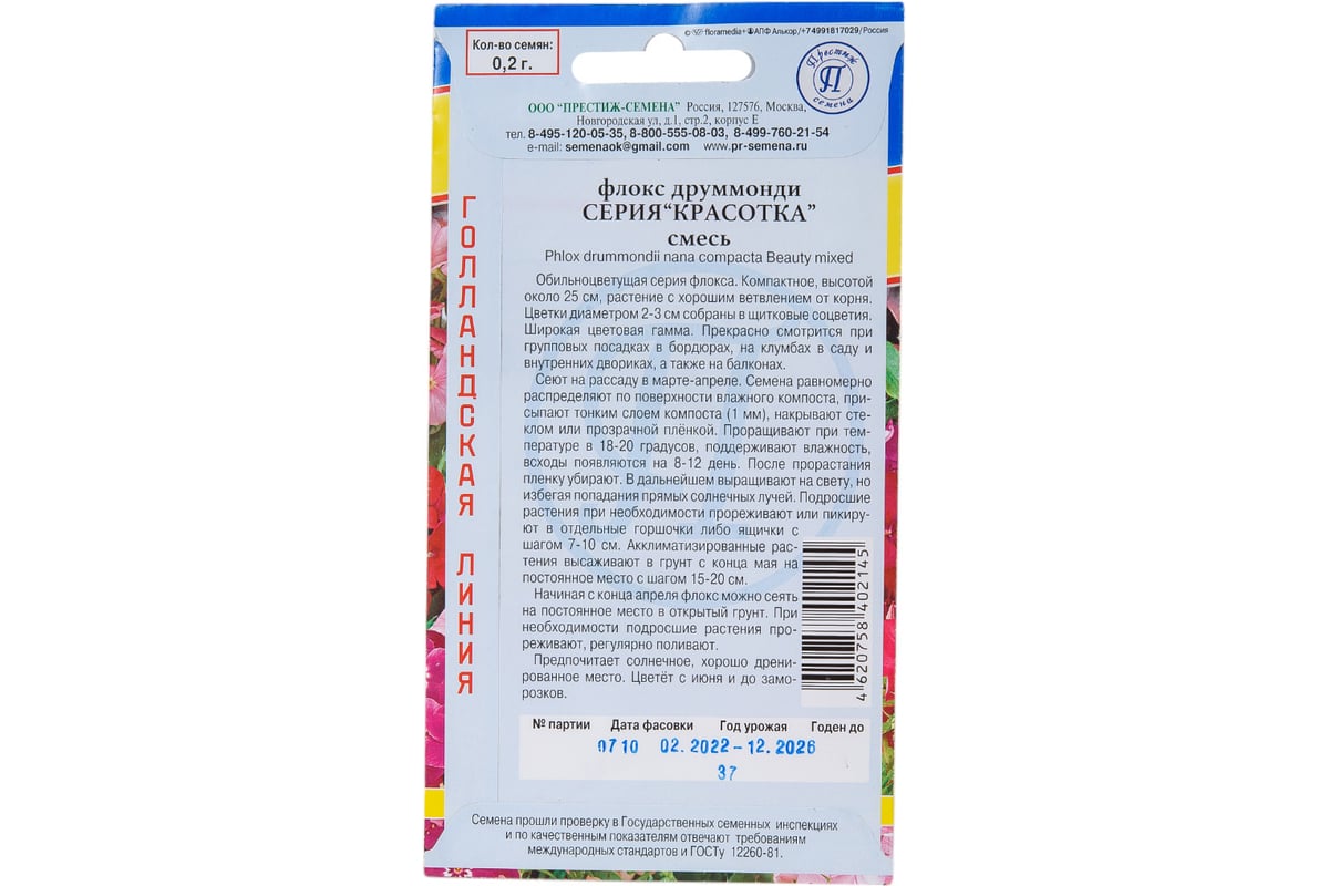 Сеют на рассаду в марте-апреле. Семена равномерно распределяют по поверхности влажного компоста, присыпают тонким слоем компоста (1 мм), накрывают стеклом или прозрачной плёнкой. Проращивают при температуре в 18-20 градусов, поддерживают влажность, всходы появляются на 8-12 день. После прорастания пленку убирают. В дальнейшем выращивают на свету, но избегая попадания прямых солнечных лучей. Подросшие растения при необходимости прореживают или пикируют в отдельные горшочки либо ящички с шагом 7-10 см. Акклиматизированные растения высаживают в грунт с конца мая на постоянное место с шагом 15-20 см. Начиная с конца апреля флокс можно сеять на постоянное место в открытый грунт. При необходимости подросшие растения прореживают, регулярно поливают. Предпочитает солнечное, хорошо дренированное место. Цветёт с июня и до заморозков.