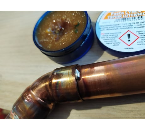 Какой-то непонятный литол способствует тому, что припой собирается в шарики, вместо того, чтобы затекать в зазор между трубой и фитингом. Труба и фитинг чистые! Предварительно зачищены, всё по технологии!