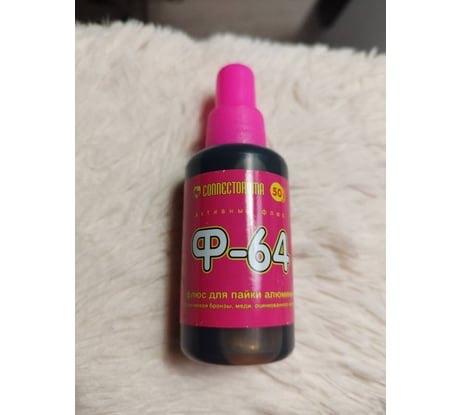 Ф-64 – флюс, который легко справляется с таким сложным для пайки металлом как алюминий. Прочная окись алюминия, покрывающая очень прочной плёнкой этот металл, сдаётся под натиском активного флюса Ф-64. Дозатор позволяет точно нанести флюс на место пайки. Случайно опрокинутый открытый флакон не доставит проблем – из него не выльется ни капли. От цвета флюса его качество и состав не меняется. Цвет флюса может быть от прозрачного до тёмно-коричневого.