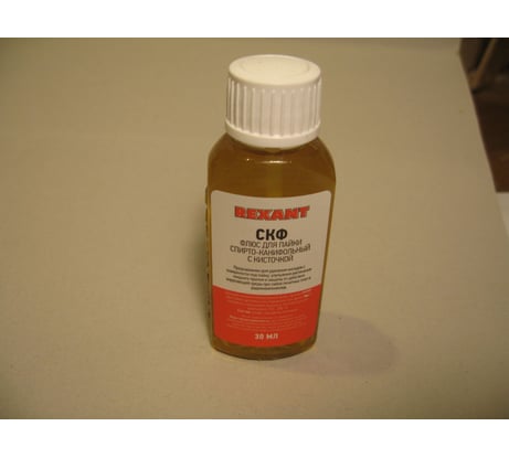 Флюс СКФ (спирто-канифольный) REXANT предназначен для удаления оксидов с поверхности под пайку, улучшения растекания жидкого припоя и защиты от действия окружающей среды при пайке печатных плат и радиокомпонентов. Наиболее эффективен при работе с медью и ее сплавами. Изготовлен в соответствии с ОСТ 4Г 0.033.200. Часто используется для ремонта радиоаппаратуры. Температура наибольшей активности: +250...+280°С. Данный флюс является нейтральным, то есть не вызывает разрушение металла, поэтому по окончании пайки смывка не требуется. В процессе хранения при низких температурах допускается образование осадка, не влияющего на качество флюса. Основные компоненты: связующая жидкость и канифоль. Вариант фасовки – флакон объемом 30 мл. Крышка оснащена кисточкой для удобного нанесения.