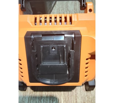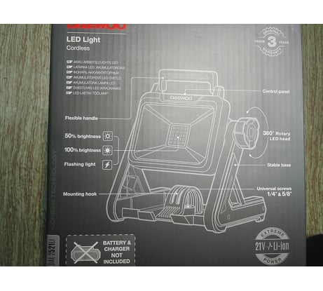 Аккумуляторный, имеет крепления 5\8 и 1\4 из алюминия, можно накрутить на штатив к примеру Elitech 204900, радиатор в почти весь корпус из алюминия с ребрами, виден через щели в корпусе для охлаждения. Корпус - Абс пластик(чего например нет в их же триммере DAEWOO DABC 4242Li, как будто разные фирмы делали, пластик прожектора качественнее на ощупь, шершавый, матовый). Аккумуляторы макитоподобные подходят, сам использовал тругрин.
