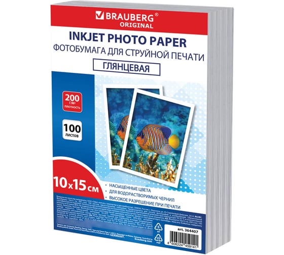 Фотобумага BRAUBERG глянцевая, 10x15 см, 200 г/м2, односторонняя, 100 листов, ПАКЕТ, 364407